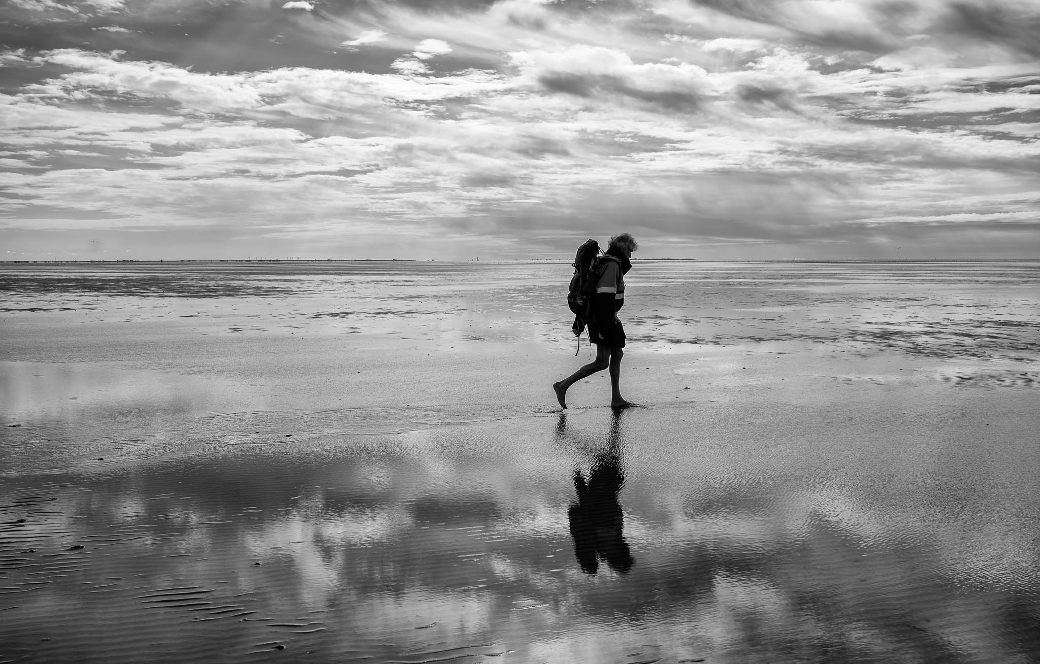Von der Hallig starten wir den herausfordernden Marsch durch das Watt bei kalter Luft und starkem Wind aus West. Bald liegt das Watt offen vor uns – ein weiter Raum aus Sand, Rippelmustern und Prielen im hellen Gegenlicht. Wir gehen durch eine Landschaft, die sich mit jedem Wetter neu formt. Der Horizont bleibt weit, die Geräusche gedämpft. Je weiter wir gehen, desto deutlicher wird die Abgeschiedenheit dieses Ortes.